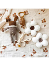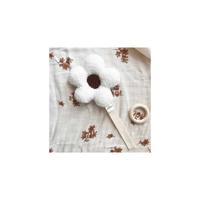 Fleur en moumoute avec lanière en coton pour être utilisée en attache tétine, en hochet avec le petit anneau en bois qui est livré avec, ou en décoration dans la chambre de votre enfant