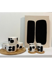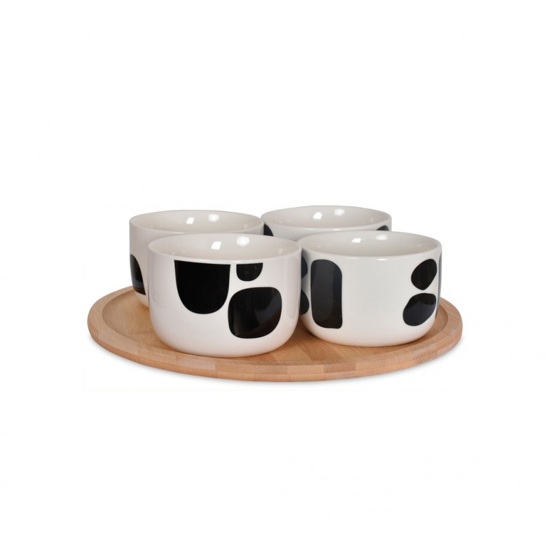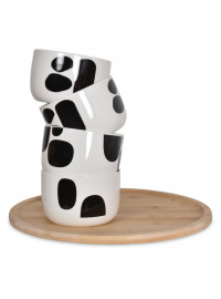 Coffret contenant 4 coupelles en faïence et plateau en bambou. Les coupelles sont adaptées au lave-vaisselle et au four à micro-ondes. Les sous tasses en bambou huilé ne doivent pas être mis au lave-vaisselle ou au four à micro-ondes. Chaque coupelles possèdent une ganse de couleur différente en haut.